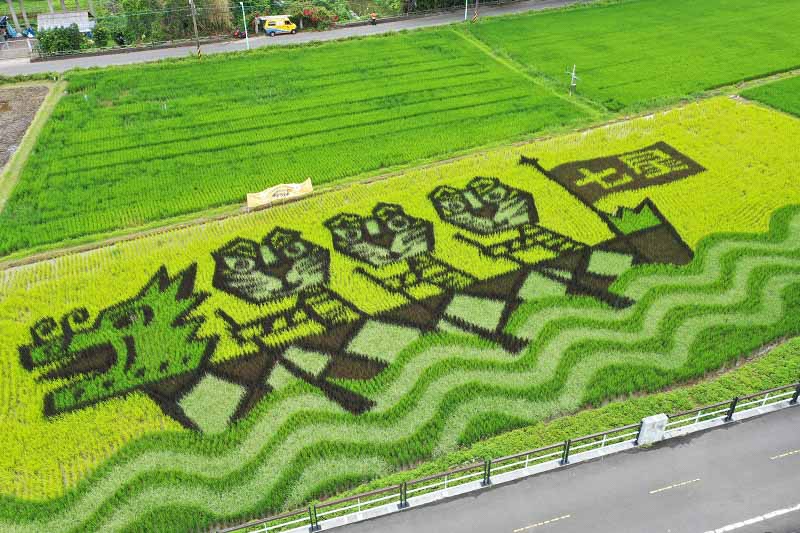 今年彩繪稻田邀請到童畫大師-趙國宗老師,以童趣質樸的創作風格結合關渡平原原生自然環境元素,手繪創作「虎虎生威向前衝」水稻地景藝術主題,運用白、黃、綠、紫、黑不同品種水稻編織出老虎同心協力划龍舟,努力合作的意象。另特別空拍影片,民眾即使無法前往,在手機上也能透過影片共同欣賞關渡平原彩繪稻田之美,希望用這片彩繪稻田一同與民眾守護台灣!