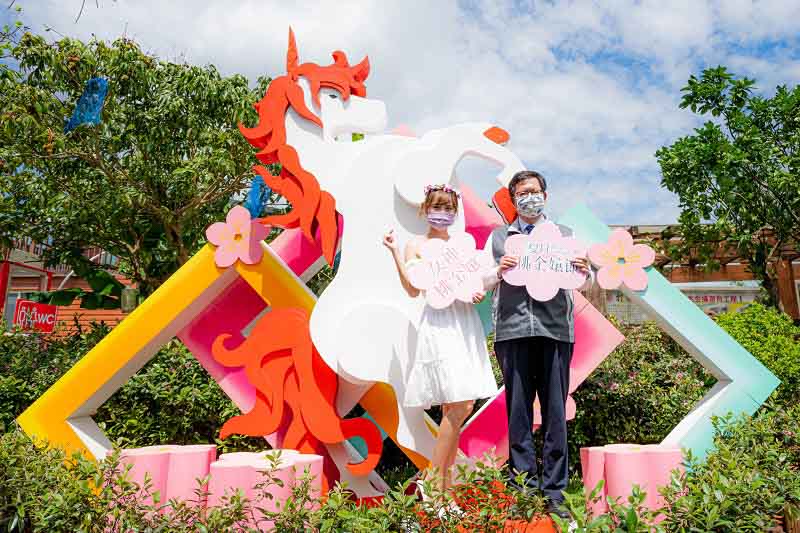 鄭文燦說明,本次活動以「女神降臨、幸福殿堂」為主題,展區設置女神坐騎「彩虹獨角獸」、「女神宮殿」、「彩虹舞台」等三大裝置藝術,花田中設有適合拍照打卡的桃金孃座椅,活動適逢端午連假及週末,規劃了音樂表演、小農市集、農事體驗、小旅行、桃金孃小學堂、夏日桃金孃飲等多元活動,邀請民眾走出戶外,一起到坑子溪休閒農業區欣賞桃金孃花海、感受山林田園的魅力。