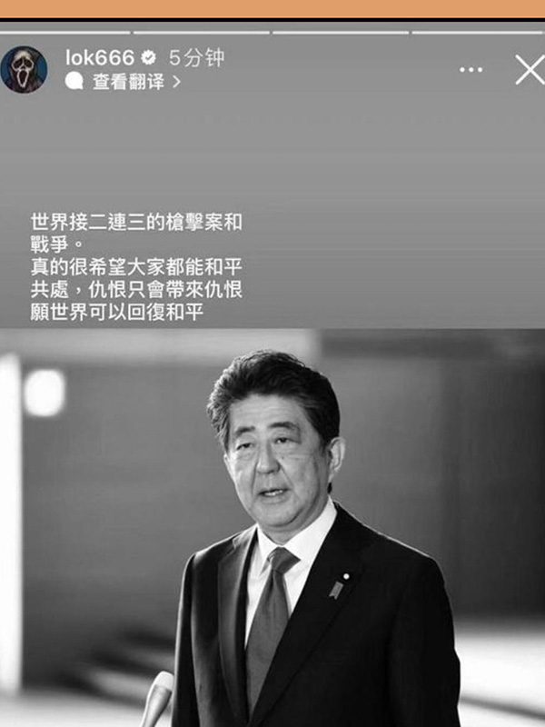 安倍晉三遇刺身亡後,不少人紛紛在公開平臺發文哀悼,其中港星余文樂也在IG限時動態寫道:「世界接二連三的槍擊案和戰爭,真的很希望大家都能和平共處,仇恨只會帶來仇恨,願世界可以回復和平。」並且分享一張安倍晉三的黑白照片,寫下「R.I.P」盼逝者安息。