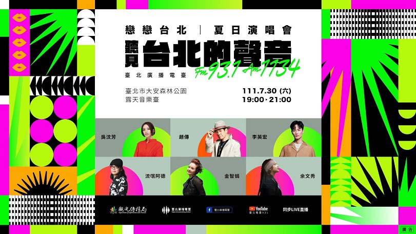 2022盛夏夜晚,臺北電臺「戀戀台北-夏日演唱會」重磅回歸,本週六(30日)晚上7點於大安森林公園露天音樂臺熱鬧開唱!本次演唱嘉賓由搖滾男高音趙傳、華語歌壇教母金智娟、金曲臺語歌王流氓阿德、音樂才女花仙子吳汶芳、文藝臺客王子李英宏、創作歌手余文秀輪番上陣演出,在綠意環繞的城市夏夜,讓台北好聲音的正能量,療癒因疫情影響而焦慮不安的心情。