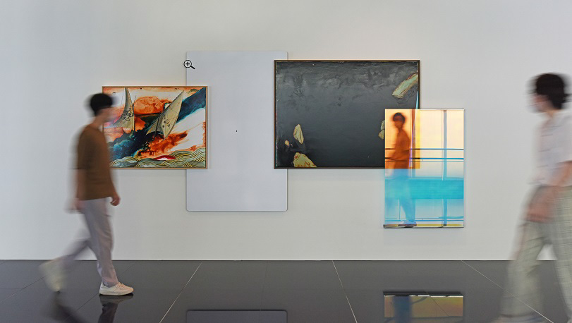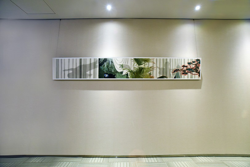 在中信園區展出的四件臺灣當代繪畫作品,皆出自「中國信託當代繪畫獎」,該獎項首獎、優選共四件作品,由中國信託文教基金會典藏,中國信託銀行借展,展示在公共空間及辦公區域。周代焌《島嶼.今昔.思想起》讓A棟三樓公共空間變身時空迴廊,把人帶進島嶼的歷史脈絡,更將你我反射其中。本來在此「交通樞紐」展示的作品,是澳洲藝術家瑞貝卡翻頁時鐘裝置《自動旋轉的世界》,換展之後,常有中國信託員工、路過的民眾驚覺「哪裡不一樣了」,進而好奇駐足。周代焌作品屢被國內外美術館典藏,很開心由企業典藏、展示,吸引更多人觀賞,「作品能從白盒子空間走出來,跟以往典藏或展覽經驗相比,我更在乎這些『觀賞者的眼光』,因為他們並非特別到美術館看展覽,所以每一個停留、眼神、想法,更讓我覺得有趣,很值得探討。」