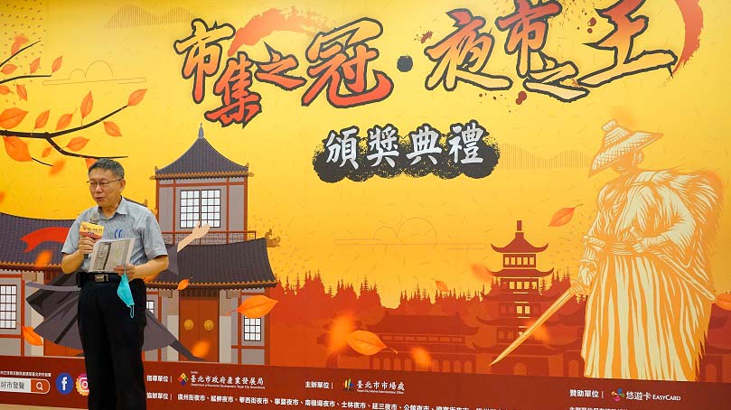 臺北市政府今(20)日舉辦2022臺北夜市打牙祭「市集之冠.夜市之王」頒獎典禮,今(111)年經過秘密客評選、民眾網路票選之後,最後選出5大類共15攤的「夜市之王」,並由市長柯文哲頒發獎金給獲獎攤商。柯文哲在致詞時表示,北市府市場處今年總計規劃1億元以上的經費,辦理市場、夜市等的改進措施,務必讓臺北夜市的品質不輸給日本及新加坡,迎接解封後國際觀光客的到來。