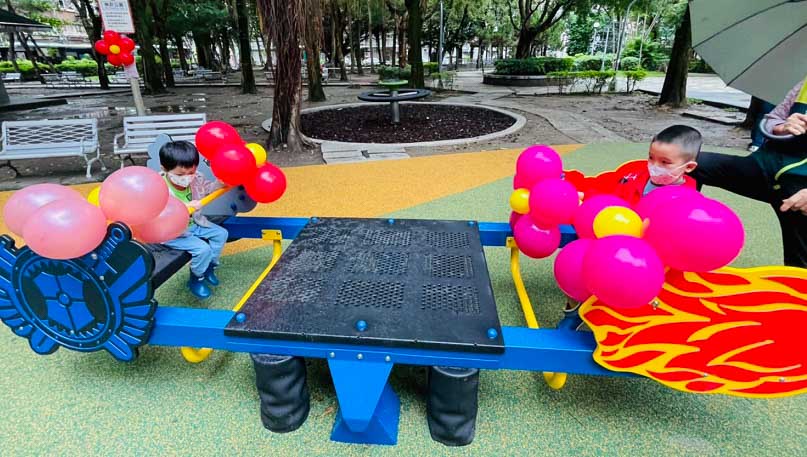 三重區六張公園新設一座兒童設施遊具組、共融鞦韆、共融翹翹板及極限旋轉飛輪,歡迎大小朋友一起來運動休閒遊憩。