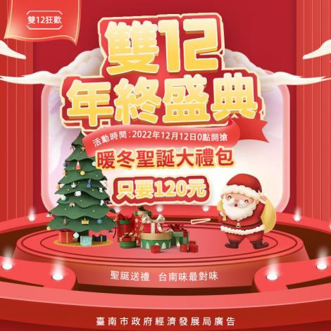 邁入12月,聖誕節的歡樂氣氛也在台南大街小巷上逐漸醞釀,在這個溫馨又歡樂的佳節之中,貼心的小禮物更能帶給家人和朋友一份不一樣的耶誕驚喜,「臺南好物線上購」在雙12購物節當日祭出「暖冬聖誕大禮包」,精挑細選臺南優質商品組成12款禮包,通通只要120元, 12月12日正式上架開賣,數量有限,售完為止,讓你聖誕送禮,送到心坎裡!