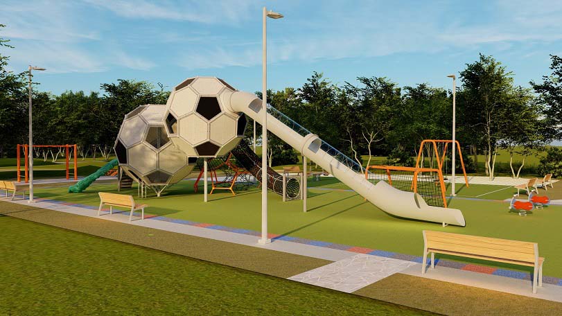 田徑場旁將全力打造兒童足球遊戲場!設置「足球造型滑梯」、「足球門造型爬架」、「攀爬架」、「旋轉柱」及「盪鞦韆」等設施;陽光草坪旁則規畫適合12歲以上的運動設施,有「跳遠區」、「爬架」、「障礙柱」及「Monkey Bar」等,可滿足闖關、挑戰的需求,勘稱最佳的「遊戲放電區」。