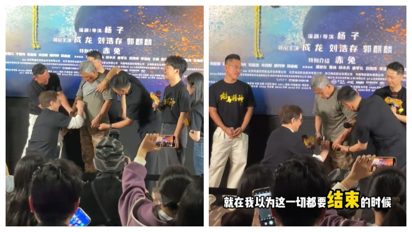 全場最令人印象深刻的一幕,莫過於周大爺準備了5件衣服請成龍幫忙簽名,但成龍一絲不耐煩的感覺都沒有,還單膝跪在地上,完全沒有巨星的架子,事後,周大爺的孫子也說:「大爺回家跟我說,上台的時候要嚇尿褲子了,很感謝成龍老師這麽大的明星一點沒有架子,當時實在是太緊張了,要不他就和成龍老師對著跪了。」