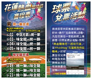 5月3日至5月5日為統一7-ELEVEn獅主場比賽,花蓮縣政府邀請大家一起進場力挺職棒,推出「兌票活動」,分為線上搶先申請500張和當日排隊換票900張,縣長徐榛蔚歡迎熱愛棒球運動的鄉親朋友來花蓮景點打卡兌票,全民力挺中華職棒賽事。