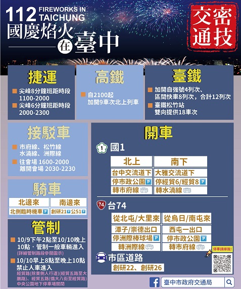 葉局長補充,高鐵公司針對明日收假人潮,也已規劃自21時起加開9車次北上列車,服務北返民眾,同時台鐵松竹站也雙向提供18車次,歡迎民眾多加利用大眾運輸工具前往會場。相關交通資訊請至官方網站查詢(https://1010.taichung.gov.tw)。
