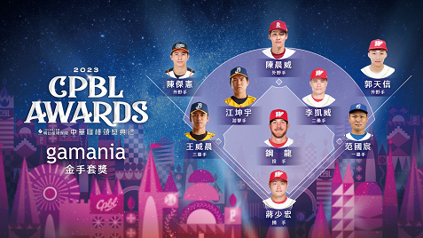 2023中華職棒Gamania橘子集團金手套獎名單揭曉,年度最有價值球員入圍名單也同布出爐,今年有6位選手蟬聯金手套獎項,王威晨連續五年獲獎,江坤宇金手套四連霸,郭天信完成三連霸,范國宸、李凱威、陳傑憲則是二連霸。