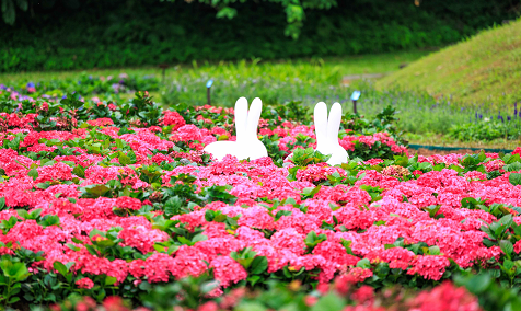 水利處河川管理科表示,花海的設計利用治水園區制高點和花叢中營造「打卡點」,沿著既有步道打造了愛心繡球花海,遊客可沿著步道走入花叢間,與繡球花近距離拍照,或悠閒漫步在繡球花小徑,感受被花海包圍的感覺, 花叢間還有兔子造型的藝術裝置,讓花海更加生動活潑,讓寒冷冬季多了熱鬧歡樂氣氛。