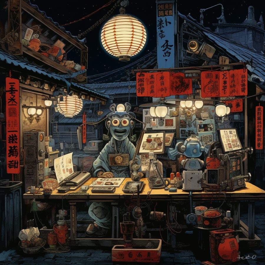 亞洲創作團隊江戶未來世(Hello Edo!),展出《屋台系列》AI生成作品,畫面中融合浮世繪藝術的風格,將未來生物、性別、機械科技、神佛鬼怪、人工智慧和賽博格等元素交融,打造充滿復古、未來與奇幻的異世界。