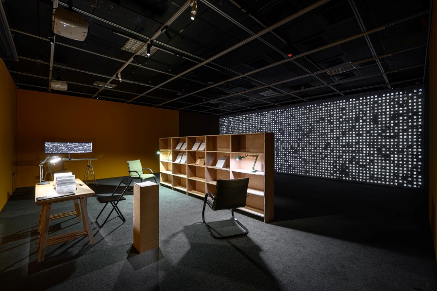 魏廷宇《百科夜行》,透過雙頻道錄像述說兩個截然不同的文本,一則由AI編輯而成,一則是藝術家的個人自白,宛如錄音帶A面與B面,透過文字堆疊不同領域的條目,建立時間與地方脈絡之中不穩定且錯誤連結的真實世界,是一種自身與公領域的相遇和重新協商。