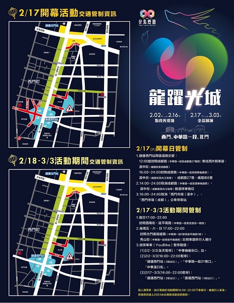 停車管制:2月17日(開幕日)14:00~24:00成都路(中華路一段至西寧南路)、漢中街(成都路至內江街)停車格取消。