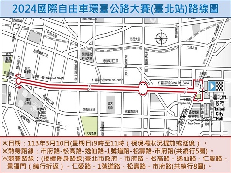 「2024國際自由車環臺公路大賽-臺北站」訂於113年3月10日(星期日)9時至12時,假本市市府路、松高路、松壽路、逸仙路、信義1號道路及仁愛路等路段舉行,屆時將有來自全球24支頂级職業車隊參賽,臺北市政府警察局為維護交通秩序與活動安全,將實施交通管制,禁止人、車通行,管制時(路)段如下: