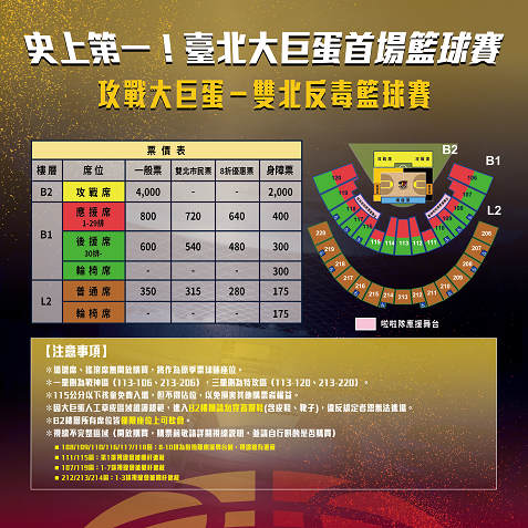 在臺北市政府及新北市政府大力支持下,雙北兩支球隊將於2024年4月13日、14日,下午2時舉辦「攻戰大巨蛋-雙北反毒籃球賽」,此次座位區將分為一壘側-戰神區及三壘側-特攻區,建議球迷朋友可以購買喜歡的球隊應援區域,集中火力給予場上球員滿滿的支持。觀眾席部分,場內B2層特別設立「攻戰席」,票價4,000元;內野看台B1層設有應援席、後援席及輪椅席,票價分別為800元、600元及身心障礙票300元;內野看台L2層則設有普通席及輪椅席,票價分別為350元及身心障礙票175元。