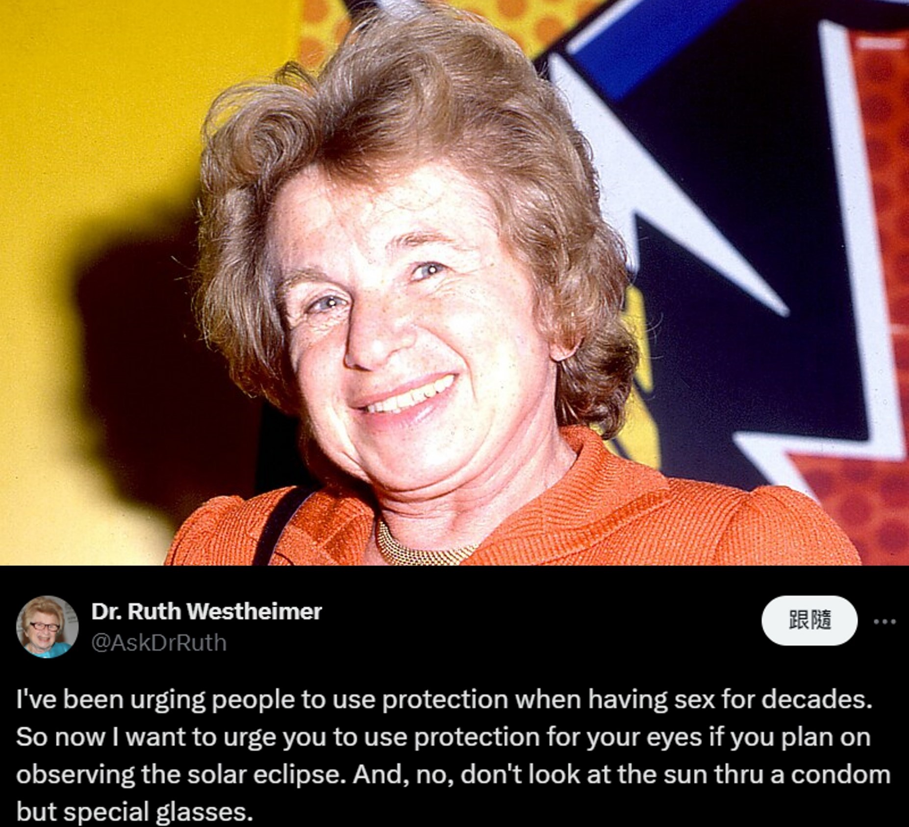 全美上下現今討論度最高的話題,就是即將在4月8日登場的「北美大日食」!這起罕見的天文現象將穿越北美多地,月球將完全遮擋住陽光,日全食的相關話題遍地開花,知名的性治療師露絲韋斯特海默博士(Ruth Westheimer)還在社群發文:「幾十年來,我一直呼籲發生性行為時,必需做好保護措施,現在我想督促大家,如果要觀測日食,請保護好眼睛,不要透過保險套看太陽,而是透過特殊眼鏡。」