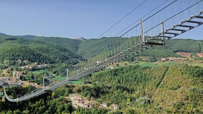 義大利古鎮塞拉諾位於翁布里亞地區,由於茂密的森林、山丘與內陸位置而被譽為義大利的「綠色心臟」,在2016年一場地震重創翁布里亞地區,許多村莊城鎮被摧毀,人口流失嚴重,於是塞拉諾市為了振興觀光與避免人口流失問題,打造話題十足的吊橋,期望帶來觀光效益。