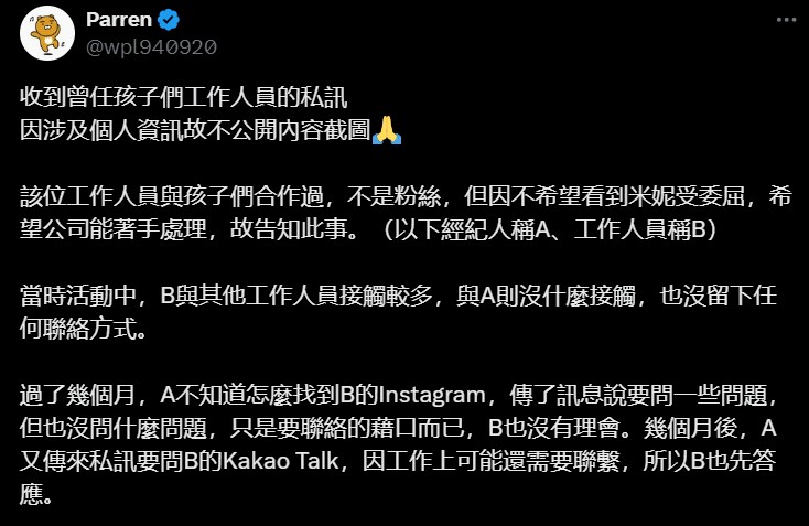 ▲網路上再爆出(G)I-DLE高階經紀人騷擾工作人員 (圖/X「Parren」)