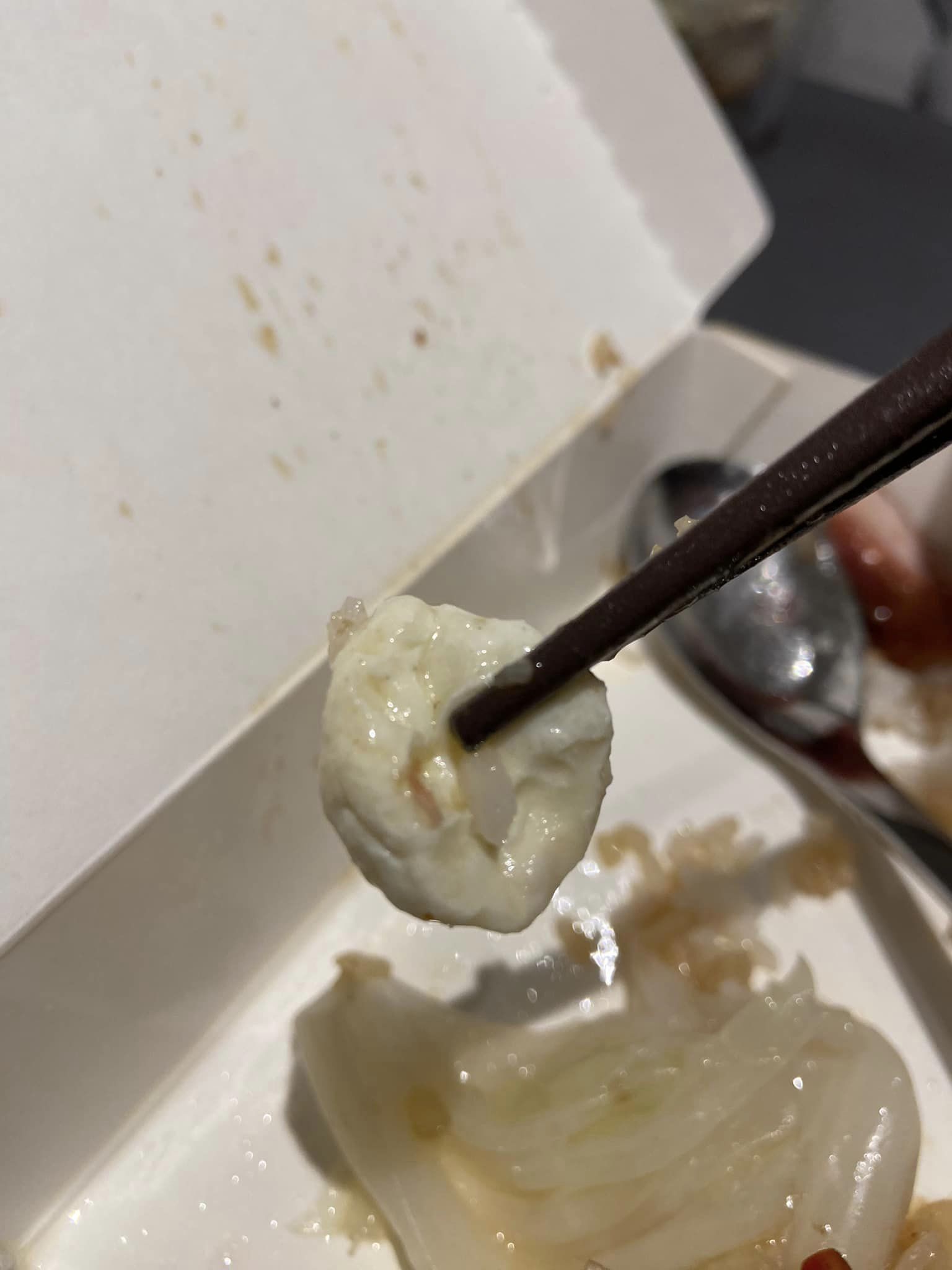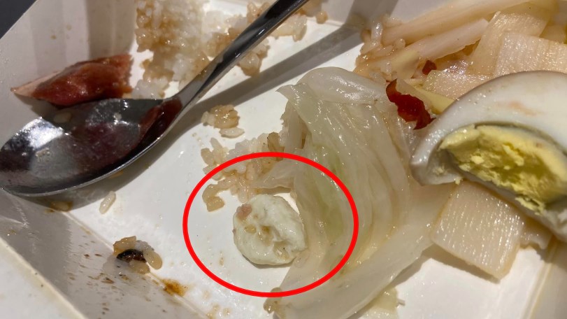 老公回:「我也以為是蒜頭還是高麗菜心,都白色的,但一咬下去有薄荷味漂出來!確定是口香糖!」他們瞬間沒了食慾,直接把還沒吃到的部份倒廚餘,然後第一時間打電話給燒臘店,但是連續打了86通電話都是忙線中。