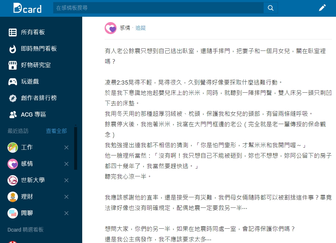 人妻在Dcard感情板發文表示,那天是凌晨2點多的大地震,而且晃了很久,久到覺得好像要採取什麼逃難行動,人妻下意識馬上抱起嬰兒床上的女兒,但彤時竟然聽到「摔門聲」,回頭一看,老公已經不見人影。