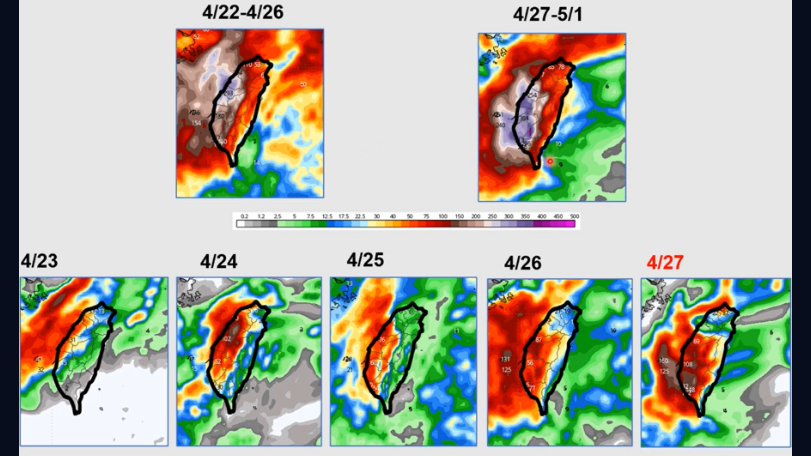 到了週四、週五(4/25、4/26)鋒面北抬到台灣以北,各地持續會有短暫陣雨或雷雨,西半部出現局部大雨的機會仍然要比東半部來得高出許多。