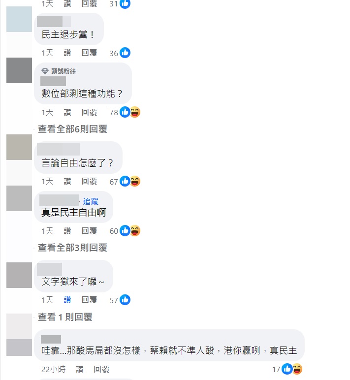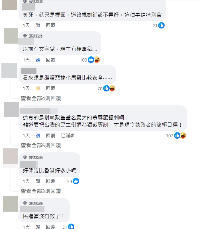 爆料公社網友看到刑事局如此大動作偵辦一張哏圖,紛紛留言表示「目前的執政黨真的不是只有爛,已經民怨沸騰了」、「自己帶動的梗圖風氣,突然指向自己就氣急敗壞溜」、「以前馬英九的照片各項kuso我還沒看過因此有人被關」、「台灣民主國際笑話」、「對付詐騙集團一點作為都沒有,對付這種Kuso特別積極」、「馬英九表示...」、「以前有文字獄,現在有梗圖獄」、「看來還是繼續惡搞小馬哥比較安全」、「這真的是對執政黨黨名最大的羞辱跟諷刺啊!難道要把台灣的民主倒退為獨裁專制,才是現今執政者的終極目標!」、「民主退步黨!」、「那酸馬扁都沒怎樣,蔡賴就不準人酸,港你贏咧,真民主」。