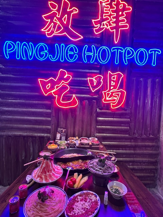 這間「萍姐火鍋·公路夜市」路面上的招牌用的是復古霓虹燈,一走進餐廳就像走進拍片搭的布景一般,有網友表示,下午5點半前就開始排隊,沒想到拿到的號碼已經是400多號了。