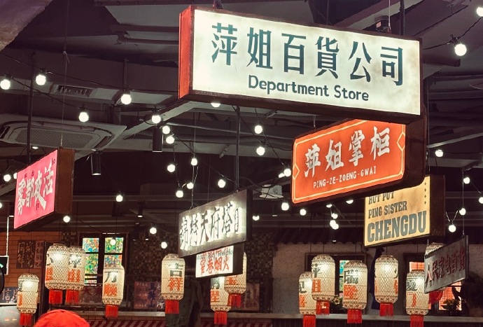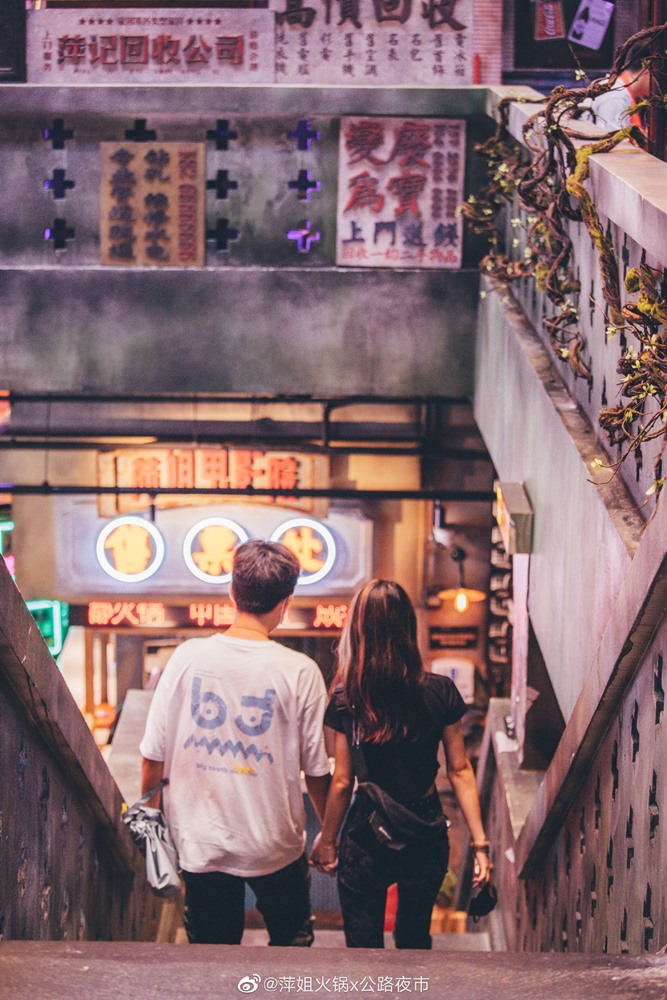 3層樓的空間挑高設計,每一面牆都沒有空著的區塊,讓人看得眼花撩亂,布景有電影院、燒烤店、冰品店、居酒屋等等,真的很像港片夜裡的背景。燈光設計也下了心思,場景的街燈超有氛圍,逛完一圈就手機記憶體就少了一大半。接下來就讓我們來看看這間火鍋店有多特別吧!