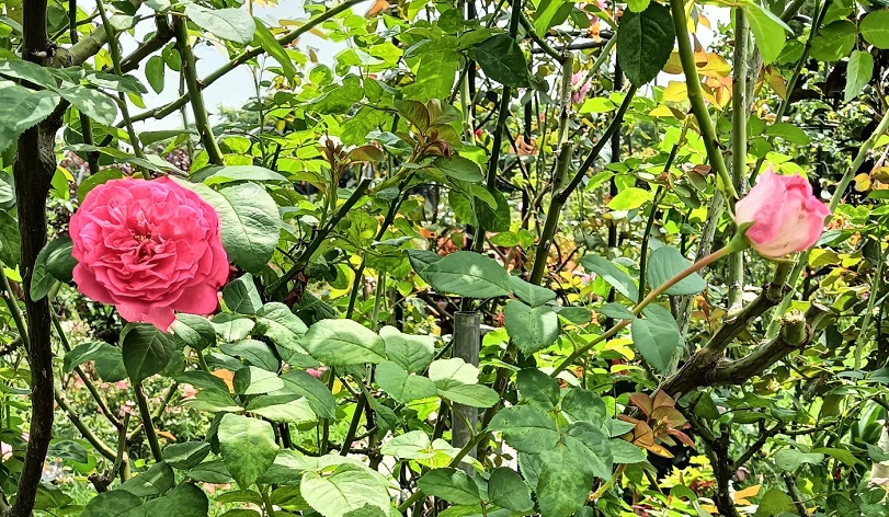 步入五彩玫瑰園區,沿著步道需要低下頭,才可以看到來自法國的杏色迷你玫瑰「水蜜桃飄移」,花心是淡黃色、微香、多花叢開,一個枝條就可以開出一束花的花量,以其強大的抗病性而聞名。攀爬在鐵架上的茶玫瑰「甘草茶」,花瓣為淺黃色,散發濃郁的甘草及老玫瑰的香氣,植株具抗濕熱的優點,在夏季仍有不錯的花況。辨識度極高的「摩洛哥公爵」,也被稱為「櫻桃派」。花瓣邊緣由粉至紅,會隨著季節呈現不同顏色變化,每株花色都不見得相似,它在2004年獲得世界玫瑰花展金牌獎項。「草莓馬卡龍」藏身在玫瑰拱門附近,花色最初呈奶油白,之後會慢慢轉粉色。只要地植,就能讓植株蔓延成粉色花海,是四季開花玫瑰。「綠冰」也屬迷你玫瑰,別稱「綠雪」,白色至淺綠的花朵,花香溫和。在日照不足時,花瓣會呈現淺綠色。皮革質地的葉片小而光亮,具有開花量多及一莖多花的特性,適合做地被和樹玫瑰使用。在靠近祕密花園區,整齊、直立型的灌木玫瑰「椰子冰」絕對能吸引大眾目光,植株高度可達150公分,顯眼的麝香粉紅色花朵,帶有果香和鳶尾花香,花瓣背面是精緻的珍珠白色。於2017年榮獲澳洲國家玫瑰試驗花園銀獎!