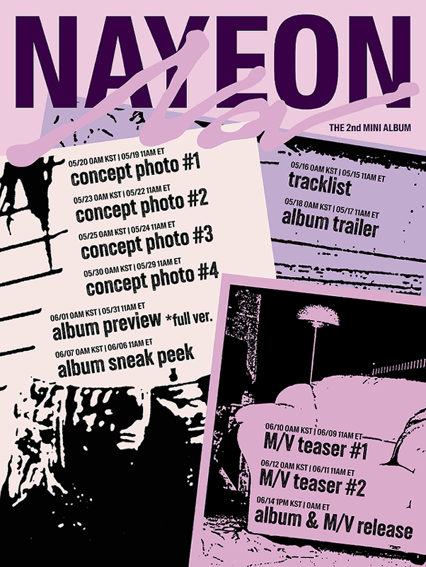 TWICE 娜璉預計 6 月底以個人第二張迷你專輯《NA》回歸,這是她繼《IM NAYEON》睽違兩年後的全新 solo 作品。身為 TWICE 成員中第一位展開 solo 生涯的人,《IM NAYEON》一發行就獲得廣大迴響,並取得「告示牌二百大專輯榜」(Billboard 200)第七名的亮眼成績。《IM NAYEON》讓她正式開啟個人的歌唱生涯,而本次《NA》將會更深入探索屬於娜璉的藝術風格。NA 一詞與韓文的「我」(나)發音相同,反映出娜璉真實的自我。