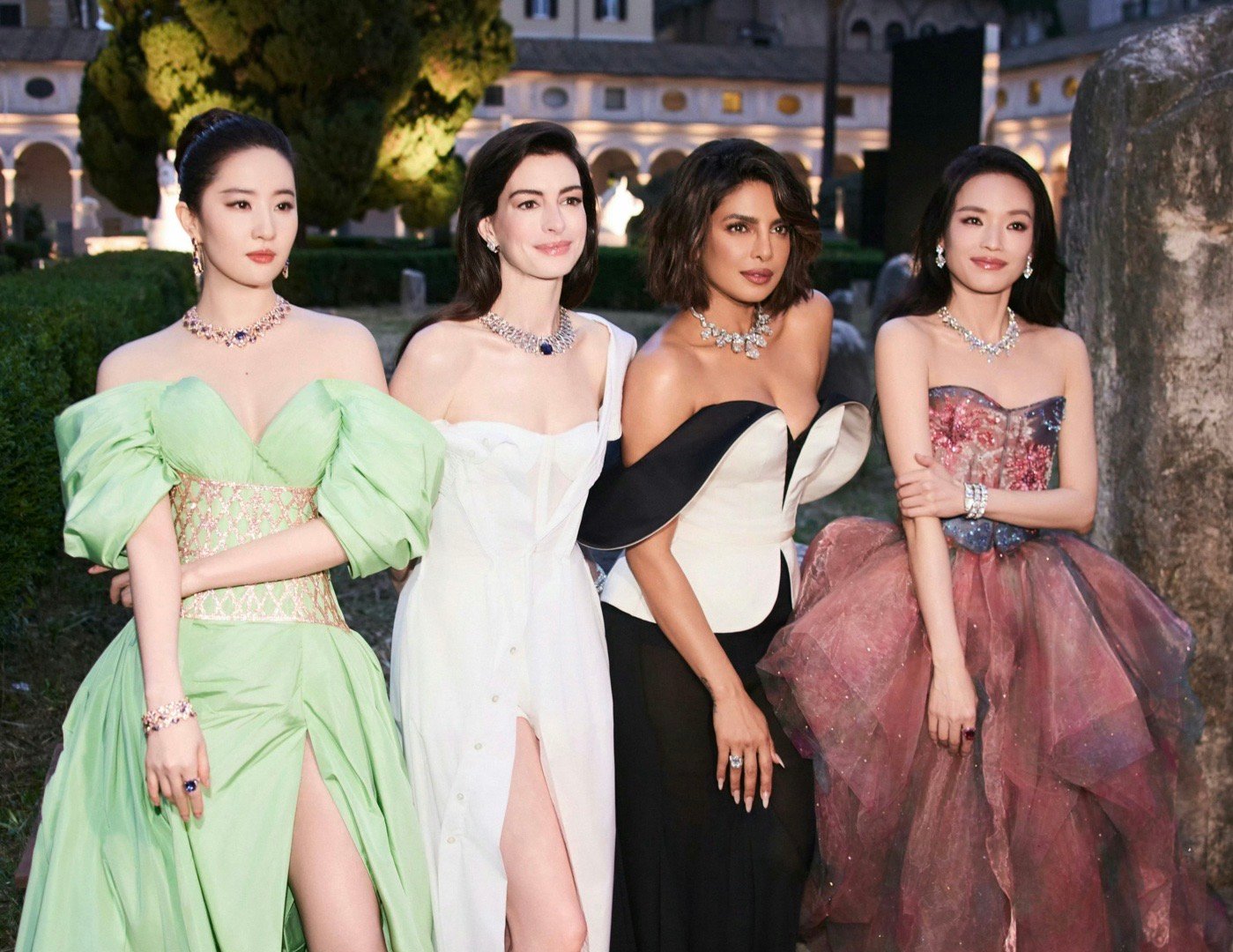 昨日品牌活動邀請了安海瑟薇、舒淇、劉亦菲、樸雅卡·喬普拉、森星5位「寶格麗女郎」,在日本女星森星還沒出場時,安海瑟薇、舒淇、劉亦菲、樸雅卡·喬普拉等四人的合照相當和諧。