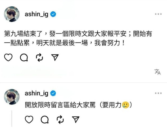 阿信昨天(5/31)晚上演唱會結束後,今天凌晨在Threads上發文:「第九場結束了,發一個限時文跟大家報平安;開始有一點點累,明天就是最後一場,我會努力!」