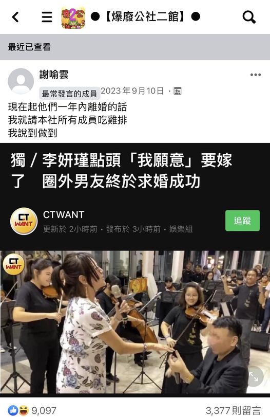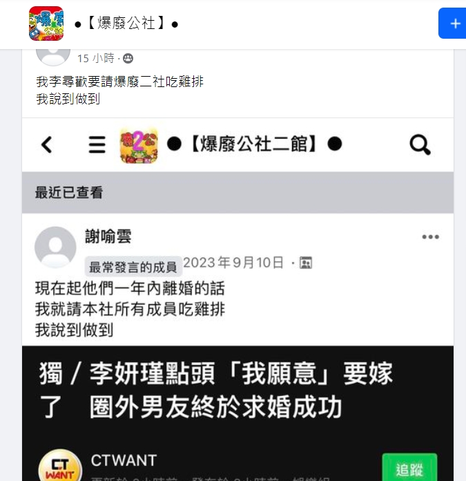 去年9月10日李妍憬與圈外男友結婚的新聞一出來,一名網友就在臉書「爆廢公社二館」發文「現在起他們一年內離婚的話,我就請本社所有成員吃雞排,我說到做到」。