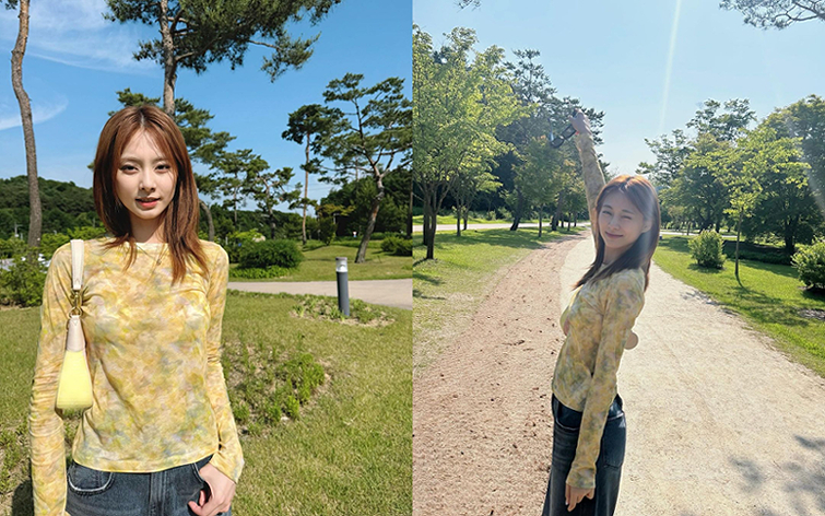 畫面中的子瑜穿著淺黃色上衣配藍色牛仔褲,在鏡頭前靦腆地笑著,即便是輕鬆隨興的打扮,也藏不住那份與生俱來的優雅,與身後的藍天綠地形成一幅絕美的景色。