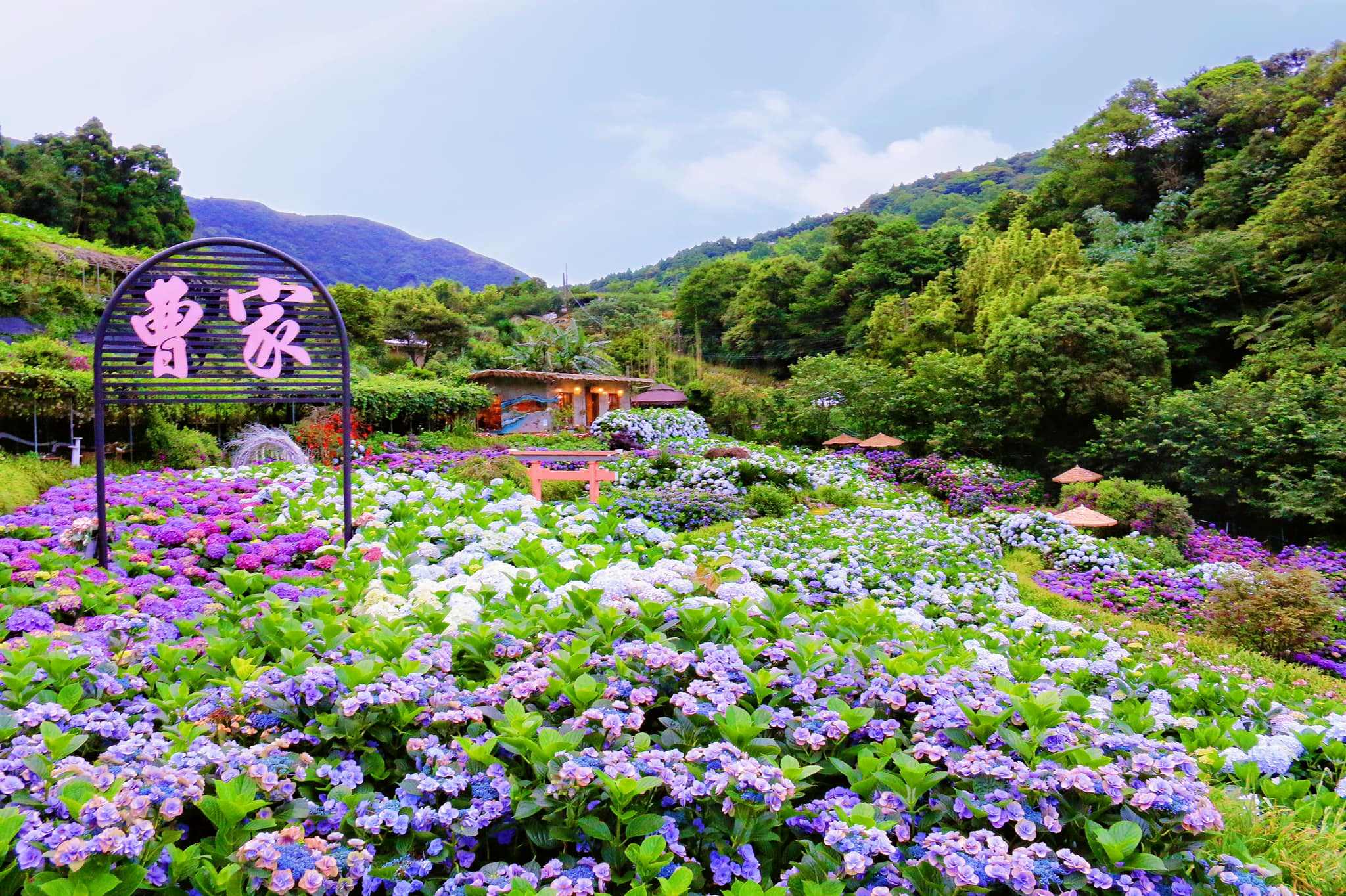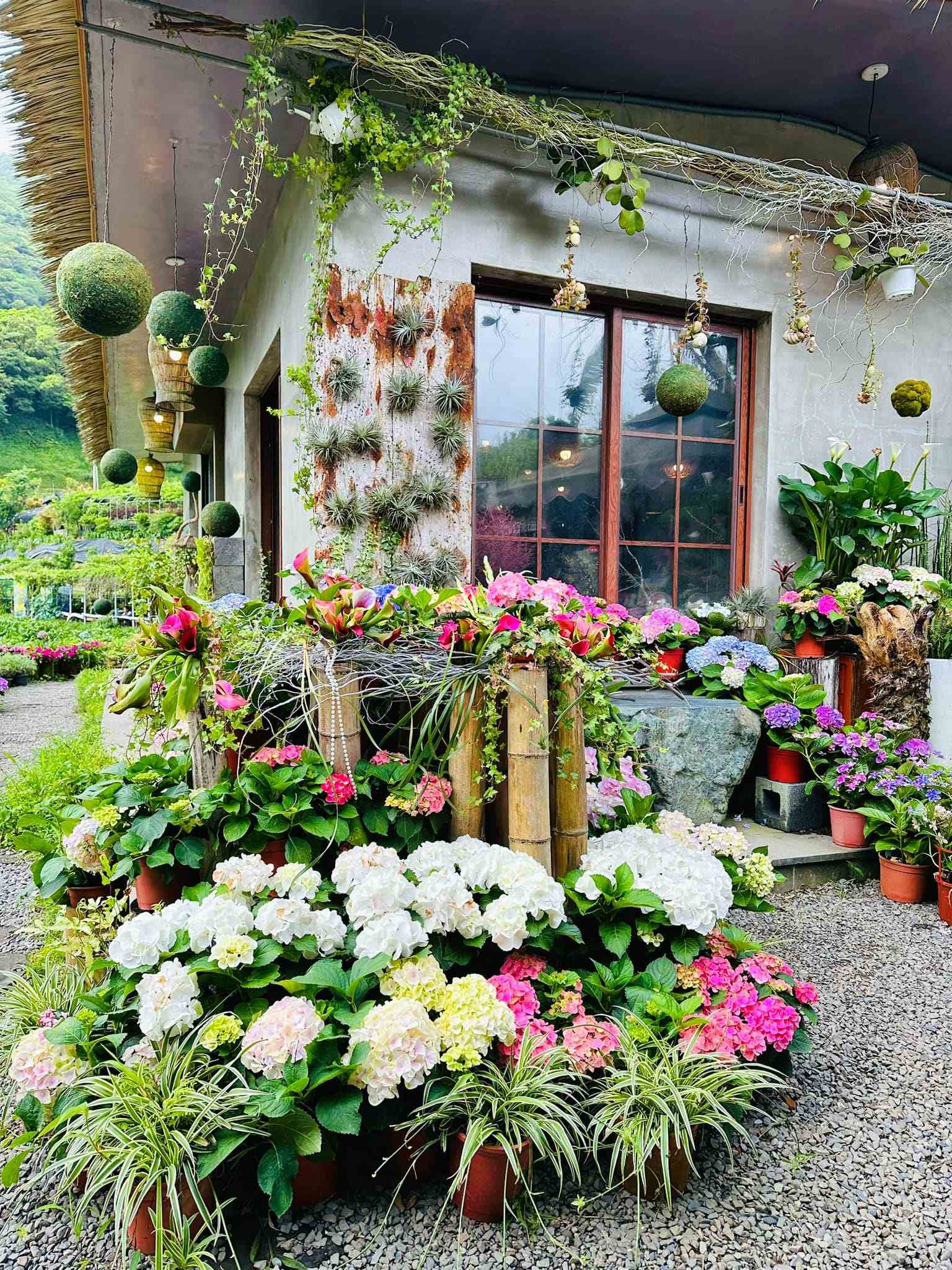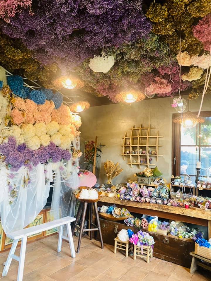 5-6月的繡球花季,園主用心打造新的地景藝術,結合梯田式繡球花海,每個角落都是打卡景點。花田旁的農村茅草屋,充滿復古懷舊氛圍,走進一看令人驚豔,從屋頂到牆面妝點各式永生乾燥繡球花,猶如掉進夢幻場景。