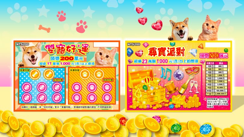 「雙寵好運」票面上Q萌可愛的柴犬與橘貓象徵「旺財」、「吉利」,好運十足又吸睛,頭獎200萬元共有6個;2款新品總獎項超過403萬個,總獎金逾14.9億元。