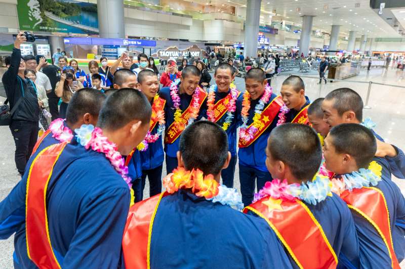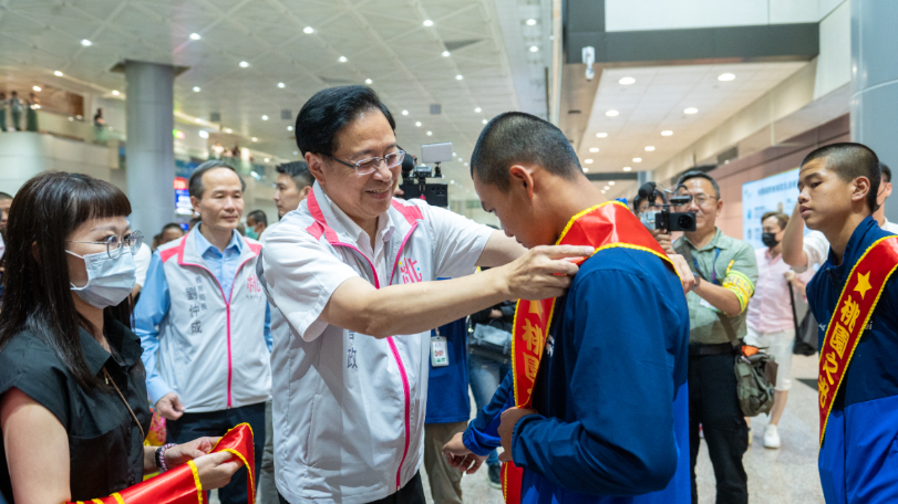 桃園市長張善政5日晚間前往桃園國際機場,出席「龜山國小及新明國中參加2024年世界少棒聯盟(LLB)亞太區少棒及次青少棒錦標賽返國接機活動」,率領市府團隊及選手家長迎接桃園小將榮譽歸國。張市長於出境大廳與球員們擊掌,逐一為選手披上「桃園之光」彩帶及花圈,並分別授旗予龜山國小及新明國中代表隊,祝福球隊於世界賽中旗開得勝,奪得世界冠軍。