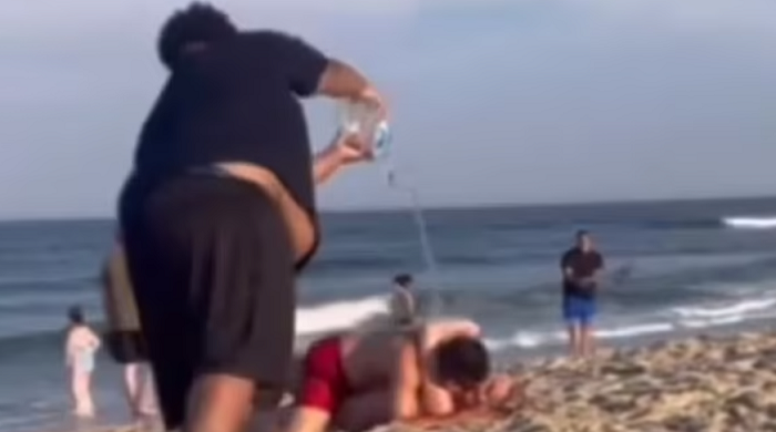 據《每日郵報》報導,最近一段影片在網上爆紅,可以看到有一對男女正在沙灘上交疊纏綿,雖然沒有脫光衣服,但兩人已經展開一陣激情熱吻,完全無視其他人的存在,接著有位身穿黑色上衣的小胖弟走向他們,手裡拿著一罐水,直接往男方的頭頂澆水,試圖滅了對方心中的那團愛火。