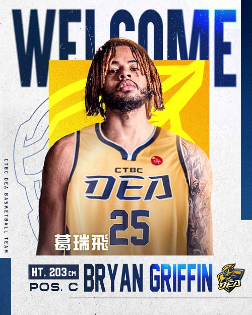 新北中信特攻外援戰力補強第三彈!日前中信特攻球團宣佈簽下美國籍後衛「捷翼」(James Eads)、中鋒「浩勝」(Chevez Goodwin),今日(6日)再公佈已與同為美國籍的中鋒「葛瑞飛」(Bryan Griffin)達成共識,葛瑞飛預計於九月初抵達臺灣,披上黃衫與閃電軍團並肩作戰!
