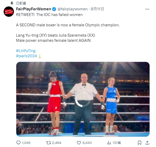 不過,諷刺的是,英國一個女權團體「Fair Play For Women」在X平台上說奧運第二次讓男人贏得女子拳擊比賽,還說男生才長得高,林郁婷就是男生,所以有身高優勢。