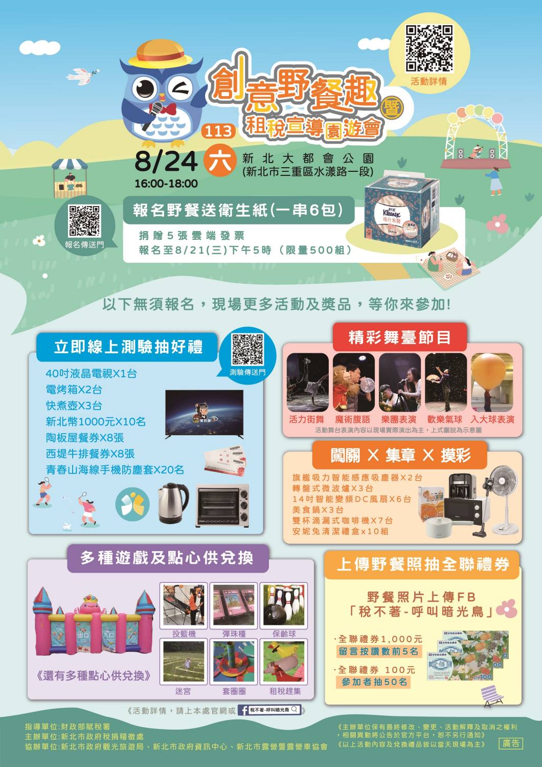 新北市政府稅捐稽徵處於113年8月24日(星期六)下午4點到6點在新北大都會公園舉辦「創意野餐趣暨租稅宣導園遊會」,活動包含創意野餐、租稅線上測驗、攤位闖關、舞台表演、FB野餐照分享,只要參加活動就有機會抽中液晶電視、吸塵器等多項獎品,邀請大家一同野餐趣!