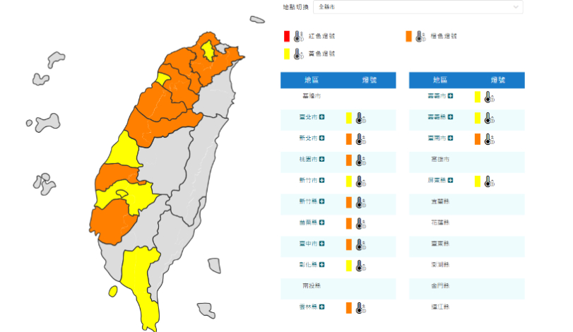 新北市、臺中市、雲林縣、臺南市為橙色燈號,有連續出現36度高溫的機率,請加強注意。臺北市、新竹市、彰化縣、嘉義縣、花蓮縣為黃色燈號,請注意。