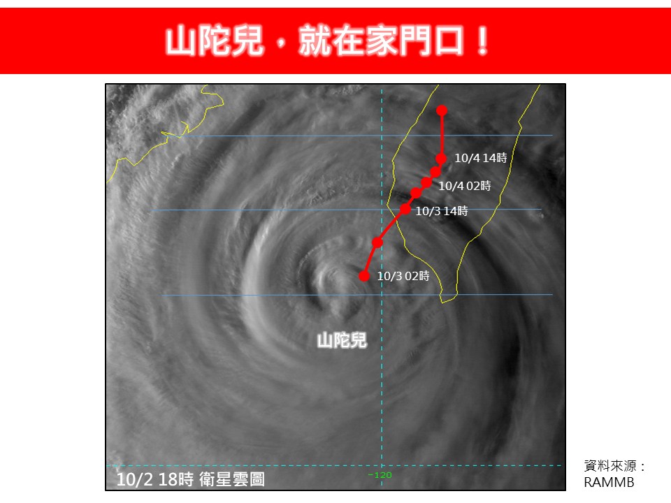 中度颱風山陀兒,目前位於高雄西南西方近海,向東北轉北北東方向移動,7級風平均暴風半徑有200公里,10級風平均暴風半徑也有60公里。