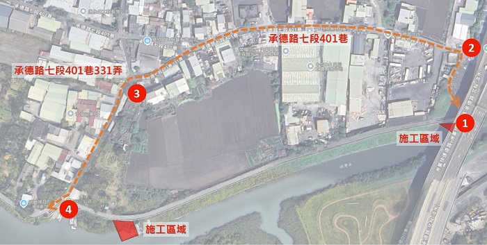 水利處籲請用路人依自行車道改道,改走承德路7 段401 巷沿路及 401 巷 331 弄接回自行車道,請配合指引路線圖改道通行,施工期間造成不便,請市民多加體諒。此外,為了大家的安全,施工期間也請勿強行穿越,以免發生危險。