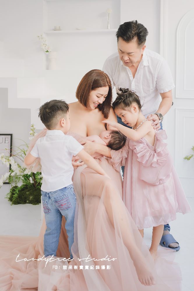 劉伊心透露,這次的哺乳寫真拍攝體會到糖果樹寶寶紀錄攝影團隊的專業,她還在化妝時,拍攝團隊就來跟大寶、二寶溝通,團隊用任務遊戲的方式來引導兩個寶貝,現場也有安撫師照顧三寶CC,連嬰兒的情緒都照顧好,讓正式拍攝非常順利,甚至提早收工。有別於新生兒寫真時的戶外拍攝場景,室內棚拍也讓寶貝們更能全神貫注,不被小昆蟲給吸引,看到成品時甚是滿意。全家福照片除了展現滿滿母愛外,也可以看出她產後狀態恢復極佳,身材四肢依舊相當纖細。
