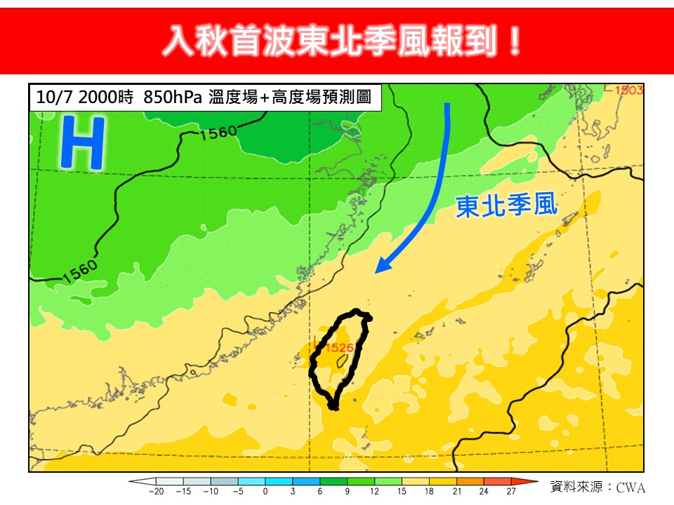 氣象專家林得恩今天(10/7)提醒,入秋首波東北季風報到!中央氣象署也說明,北台灣天氣稍微轉涼,迎風面留意短延時強降雨,中南午後雷雨。