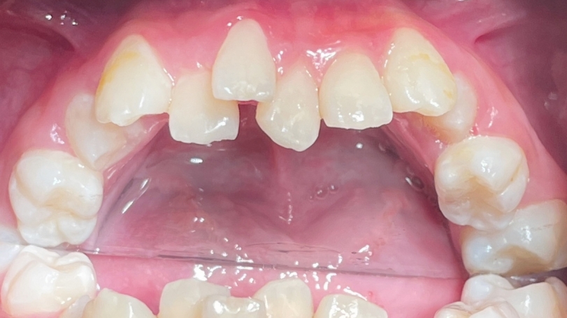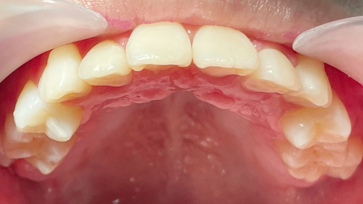 正在換牙期的小茹因齒列先天發育異常,從小就咬合不良,雖然能正常飲食,也不影響說話,但是一口亂牙令她相當困擾,因此在11歲時被媽媽帶來台北慈濟醫院齒顎矯正科評估。全口X光中看到小茹的牙齒不但亂,還有先天缺牙與阻生齒。陳宜宏醫師建議早期進行齒列矯正,也就上述狀況分別處理治療,迄今矯正一年半,先拆除上排矯正器,小茹的齒列與外觀已大幅改善,平整的門牙讓她更有自信,下排牙齒目前持續矯治中。