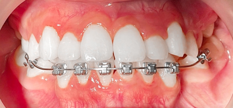 以小茹為例,經診斷其有:上顎牙弓發育不足、輕微戽斗與門牙排列紊亂、上排雙側犬齒阻生與第二小臼齒先天缺牙、下排雙側第二大臼齒阻生與右下第二小臼齒萌發方向異常。由於狀況複雜,陳宜宏醫師建議以固定矯正器加上顎兩支骨釘為主要治療方式,先針對長不出來的兩顆犬齒做電燒,讓埋在牙齦裡的齒面露出,黏上矯正器;接著拔掉兩顆上顎第二乳臼齒與打上骨釘,利用其將第一小臼齒與犬齒向後拉,同時上門齒慢慢排列整齊,考量小茹上顎先天缺牙且上下牙齒顆數必須對稱,故拔除下顎兩顆第一小臼齒來獲得空間,並將下門牙排列整齊。