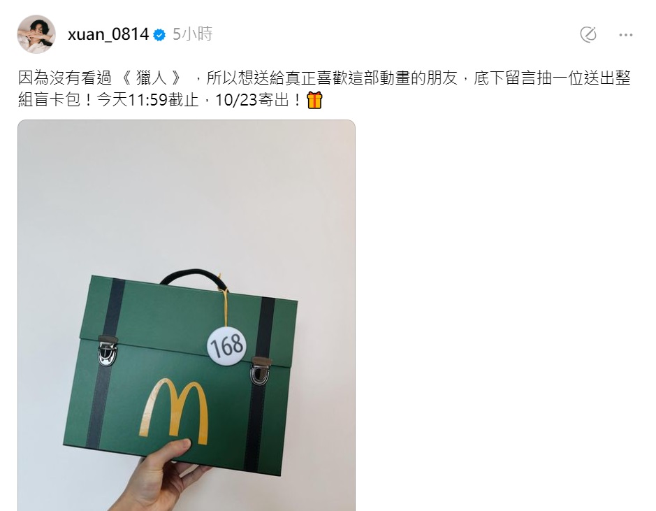 從上周末開始,就有不少網紅收到麥當勞寄出的《獵人》卡包,不過因不少人對於這部動漫不熟悉,引發部分粉絲的怒火,質疑他們為何可以有,相關話題在網上掀起熱議;黃宏軒同樣也有收到麥當勞的關愛,不過他今天在Threads上發文:「因為沒有看過《獵人》,所以想送給真正喜歡這部動畫的朋友。」他表示,會從留言區抽出一名幸運兒,將這一套卡包贈與對方。