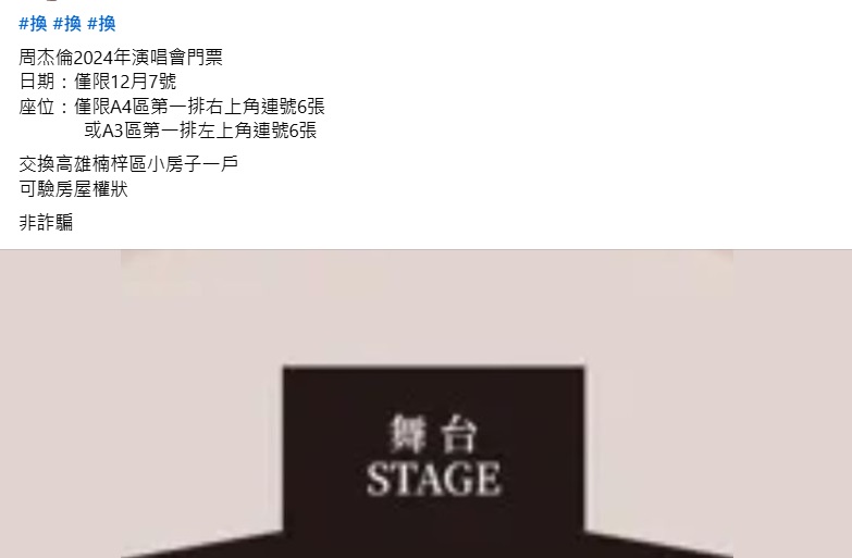 一名網友最近在演唱會門票的徵票社團發文,他說:「徵周杰倫2024年演唱會門票,僅限A4區第一排右上角連號6張,或A3區第一排左上角連號6張。」不僅如此,他還強調自己並非詐騙,且願意拿出高雄楠梓區小房子一戶做交換,還可以驗房屋權狀。